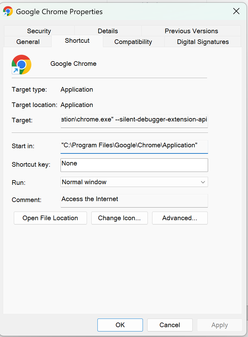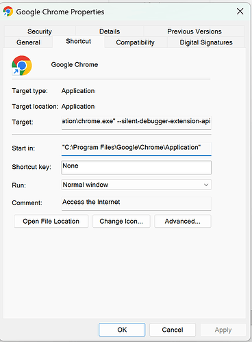 I posted in image of the Chrome shortcut’s properties at the following URL:
